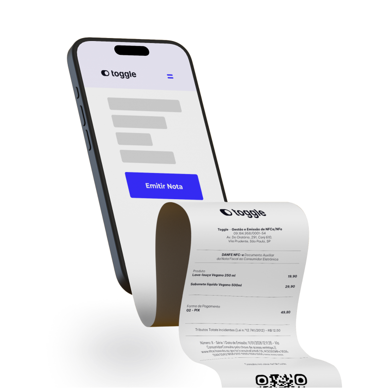 Cansado da burocracia fiscal? O Toggle emite NF-e e NFC-e em 1 clique e cuida de toda a configuração pra você. Menos erro, mais tempo pra vender.